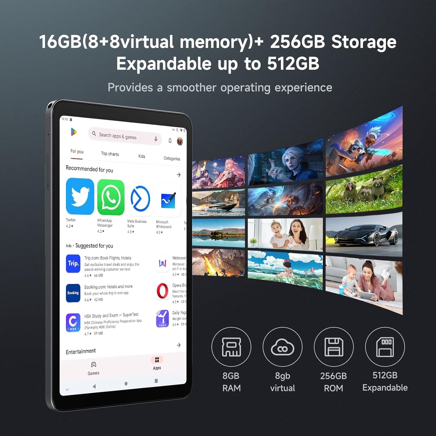 Expandable Memory: This ALLDOCUBE tablet has a fast 16GB of RAM (8+8 virtual memory), and a big 256GB of internal storage, which can be expanded to 512GB using an SD card.