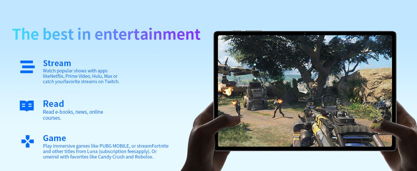 It also supports 2.4/5GHz WiFi Internet, and efficient Bluetooth 5.0 wireless connectivity keeps you connected and entertained. This Tablet supports faster 5G frequency bands with network speeds up to 433Mbps.